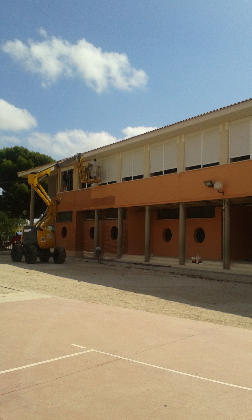 Los trabajos de rehabilitación en las fachadas del Colegio Público consta de eliminación de grietas, renovación de persianas, cambio de colorimetria en el ladrillo visto y pintado del hierro en color negro.